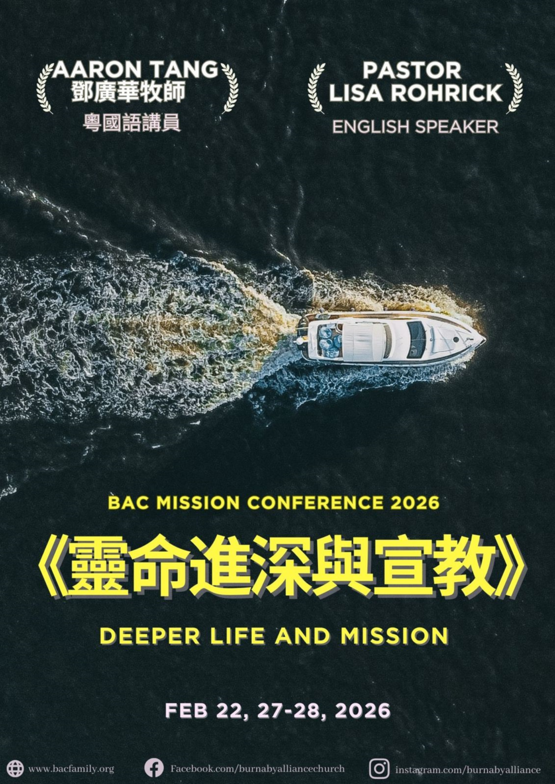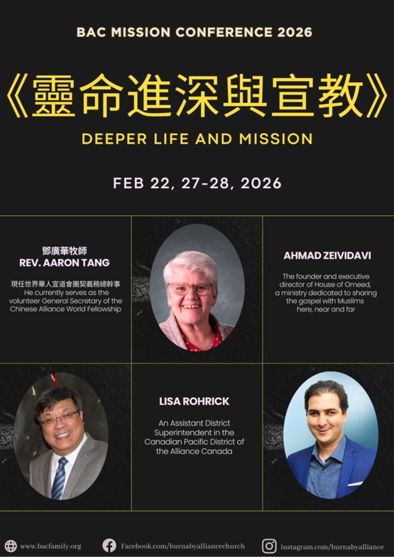 會議講者:鄧廣華牧師(粵語/國語); Lisa Roherick (英文); Admad Zeividavi(英文/青年/Joy Fellowship); Dina Zeividavi(Awana/兒童崇拜)